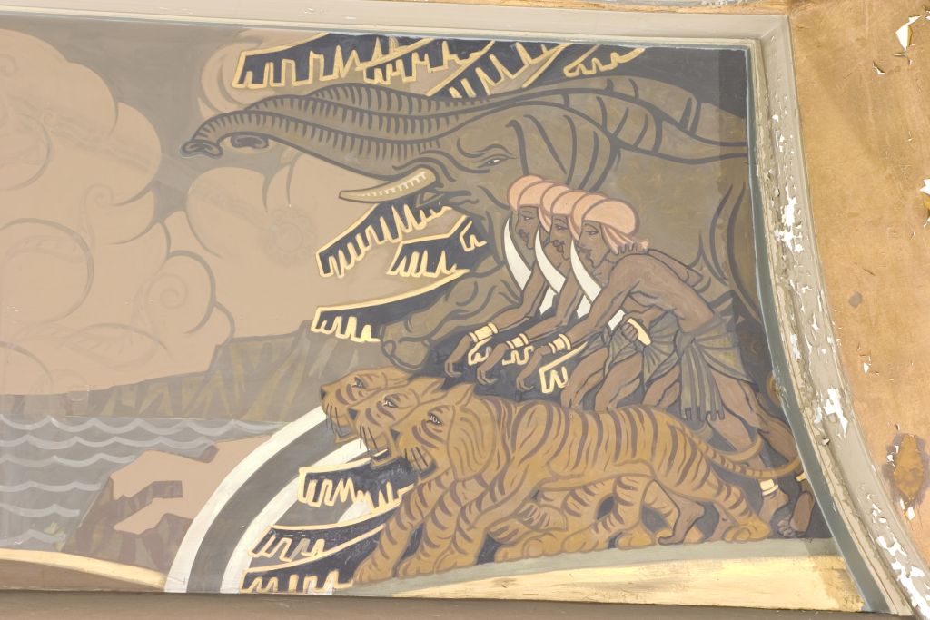 Right panel of Mural by acclaimed artist Alfred Tulk above the movie screen, Opening Day program described the “beautiful ultra-modern mural, which dedicates the theatre to the progress made by women in the history of the world. It depicts the defense of the Amazon Queen of Grecian legend against the forces of Asia on one side, with elephants, men, bows and arrows, and Africa on the other, with Egyptian scenes of warfare.”