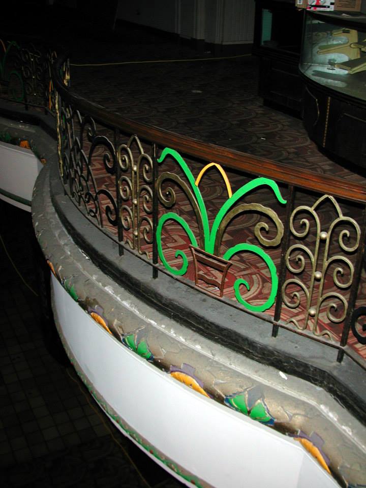 closeup of Foyer Mezzanine’s railing with Art Deco motifs & vibrant repainting done by a staffer for 1993 world premiere of the movie “Philadelphia” Concession stand at right.