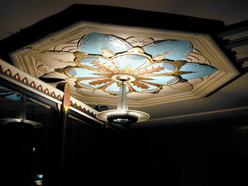 1939 Rambusch “Aura” light fixture lit up! 11 of these in the Boyd (2 in Foyer, 4 in Auditorium, 5 in Lobby) for 1953 Cinerama remodel. An example is in the lighting exhibit of the DC Smithsonian’s American History Museum (All lights now in off site storage) The ceiling & wall’s vibrant paint colors were by a theater staffer for the 1993 world premiere of the movie “Philadelphia”