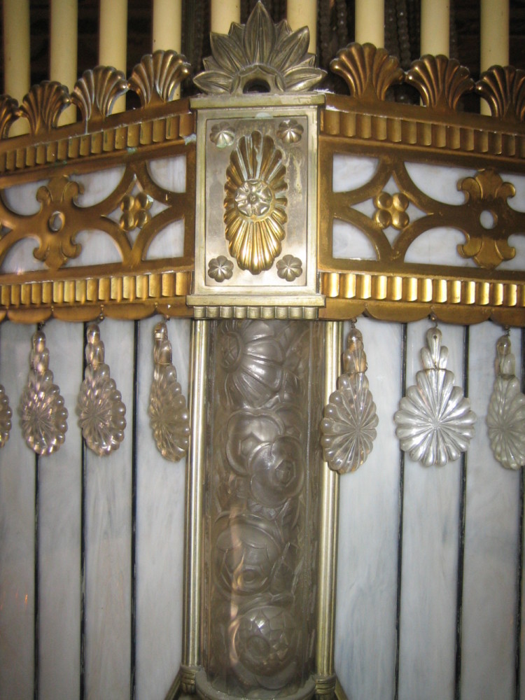 Auditorium’s central chandelier close up, with floral motif in etched glass panel. (Friends of the Boyd donated to Ulster Performing Arts Center in NY)