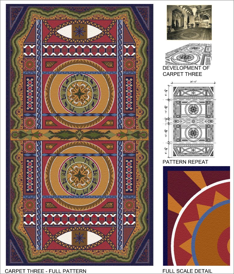 The 1928 Opening Day Program noted that the original area carpet, custom ordered from Czechoslovakia, was “harmonizing in coloring and design with the decorative scheme of the interior” and though measuring 40 x 26 feet, was woven in one piece! This rendering was part of prior restoration plans