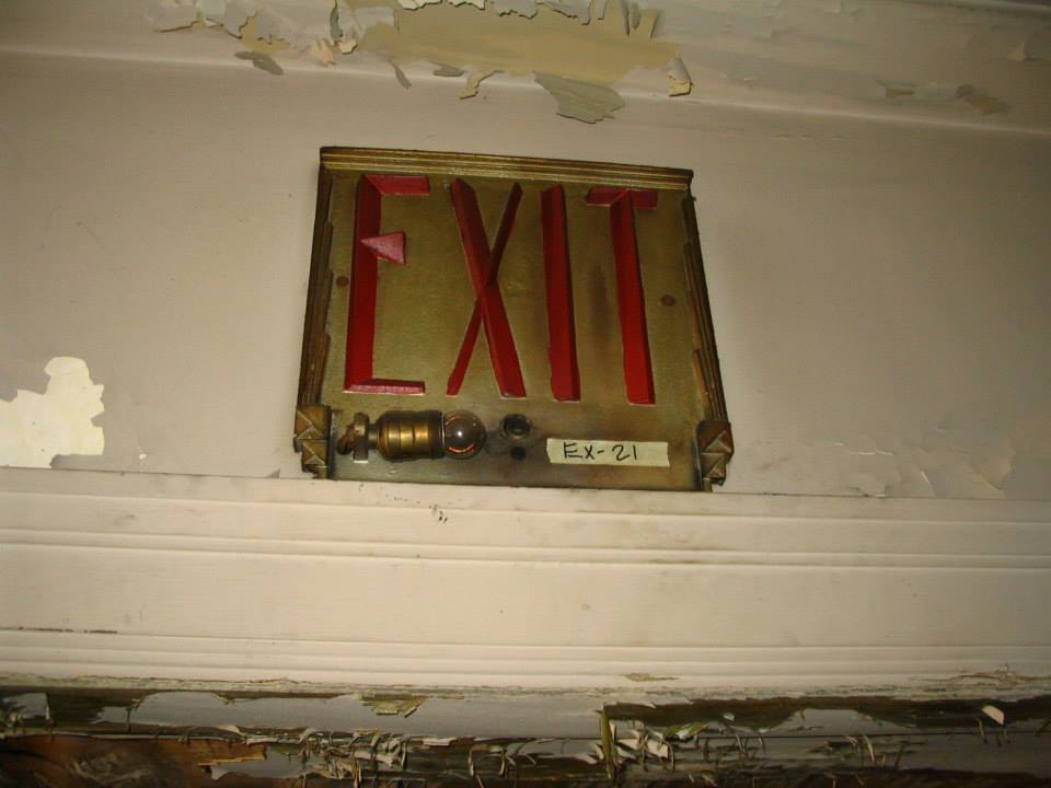 Exit Sign, one of 3 at Foyer Mezzanine facing the Lobby. Exit Signs now in off site storage. We were told during prior owner Clear Channel’s planning that the Fire Department approved their reuse.